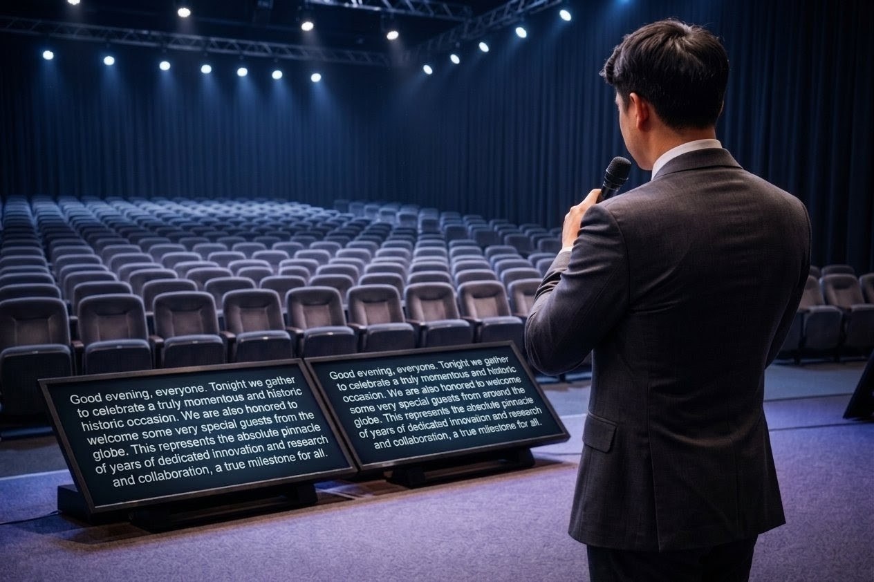 Stage TV Teleprompter, designed to enhance live presentations by providing seamless, real-time script delivery, ensuring speakers stay on point and engaged with their audience. Positioned discreetly on stage, the teleprompter allows speakers to maintain eye contact with the crowd while comfortably following the script or notes displayed on a high-resolution screen.